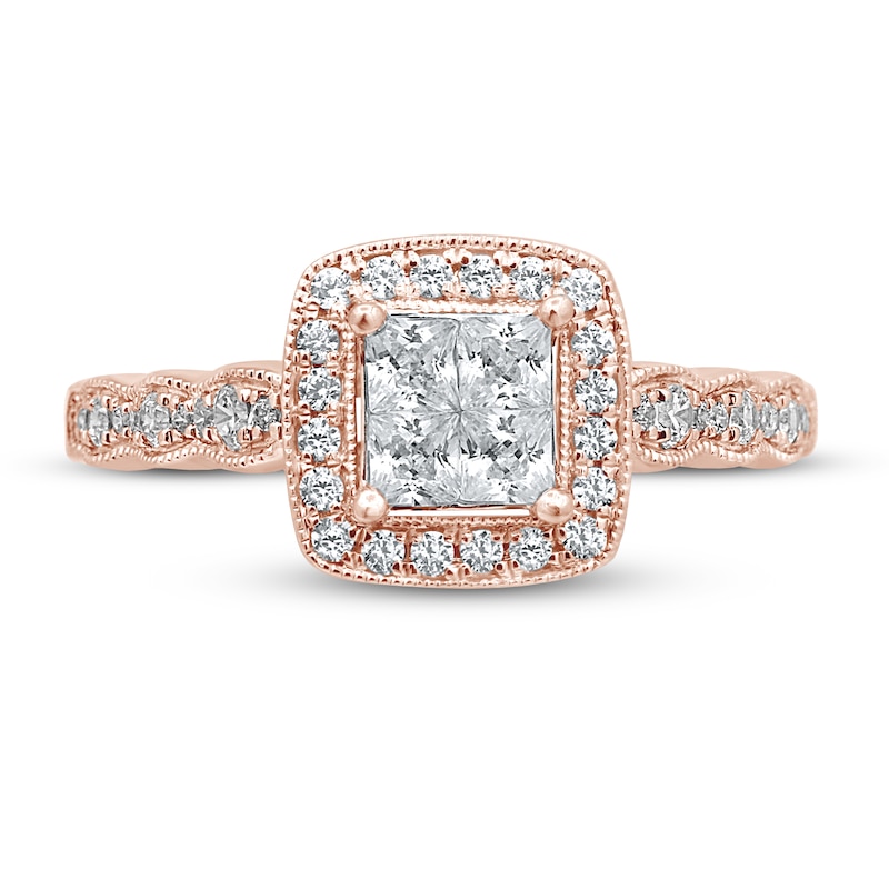 This stunning multi-diamond engagement ring for her features a quartet of sparkling princess-cut diamonds at its center. Brilliant round-cut diamonds frame the center, and more dance down each side of the band for a total diamond weight of 5/8 carat. The 14K rose gold ring showcases classic milgrain detailing to finish the look. From the Now & Forever® bridal collection.