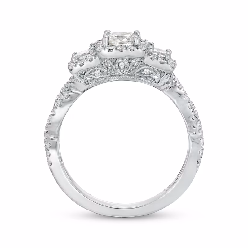 This sensational engagement ring from Neil Lane Bridal® showcases three dazzling princess-cut diamonds haloed by smaller round diamonds. Twists of diamonds adorn the 14K white gold band, bringing the total diamond weight to 1 1/8 carats.