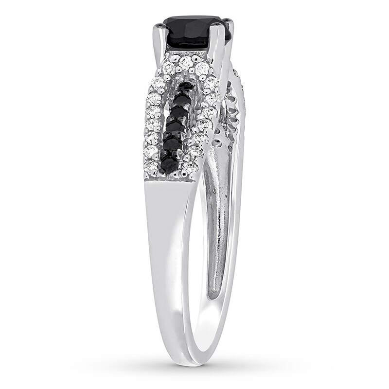 A round black diamond is the striking focal point of this elegant engagement ring. More black diamonds complement dazzling white diamonds along the band, crafted of 14K white gold. The ring has a total diamond weight of 7/8 carat. From the Now + Forever® Bridal Collection.