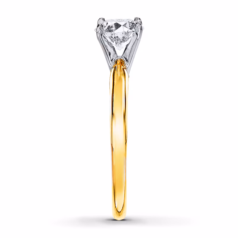 This stunning diamond solitaire ring features an independently certified, near-colorless 1 carat round diamond beautifully displayed in a four-prong setting of 14K yellow gold with 14K white gold prongs. The diamond in this fine jewelry ring is laser-inscribed with a unique Gemscribe® serial number. From the Now + Forever® Bridal Collection.