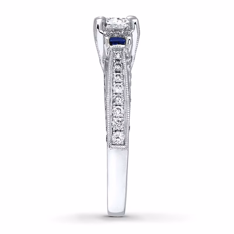 Two princess-cut natural sapphires add color and character to this lovely diamond ring. A center princess-cut diamond is surrounded by round diamonds and accompanied by more pavé-set round diamonds along the band of 14K white gold. The ring has a total diamond weight of 1 carat. Available online while supplies last. Previously Owned Treasures are not eligible for in-store pickup. Previously Owned Treasures may only be shipped either to your home address or to an alternate address. Price comparison based on new item pricing.