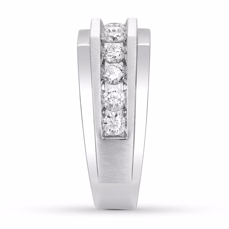 A distinguished way to commemorate your love, this handsome men's wedding band shines with round diamonds totaling 1 carat in weight. The dimensional band is crafted of 10K white gold and features brushed and polished finishes. Available online while supplies last. Previously Owned Treasures are not eligible for in-store pick-up. Previously Owned Treasures may only be shipped either to your home address or to an alternate address. Price comparison based on new item pricing.