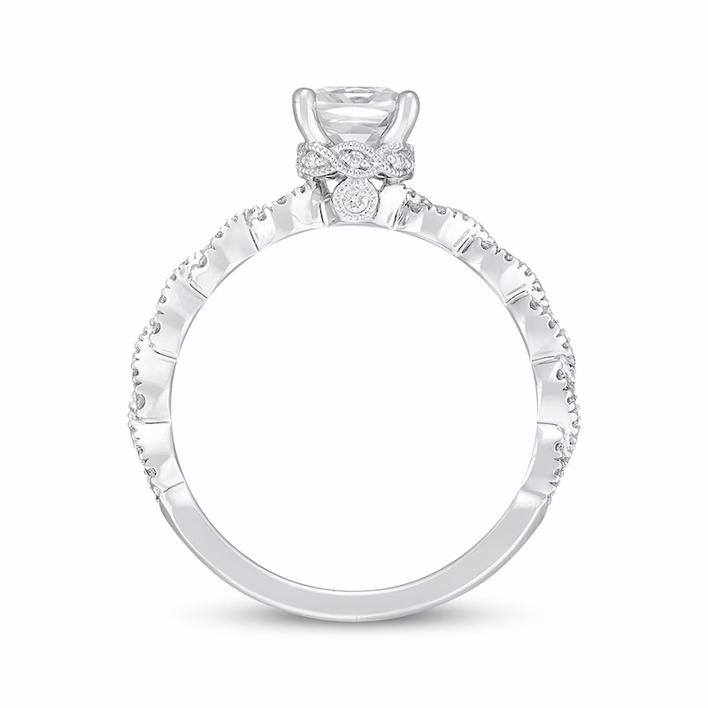 This spectacular engagement ring from the Neil Lane⢠Premiere collection features a stunning, modern design enlivened by an impressive array of independently certified diamonds. The brilliant 1-carat, cushion-cut diamond center pairs with dazzling twists of round diamonds on the band for a romantic look. Styled in 14K white gold, the ring has a total diamond weight of 1 1/5 carats. Available online while supplies last. Previously Owned Treasures are not eligible for in-store pickup. Previously Owned Treasures may only be shipped either to your home address or to an alternate address. Price comparison based on new item pricing.
