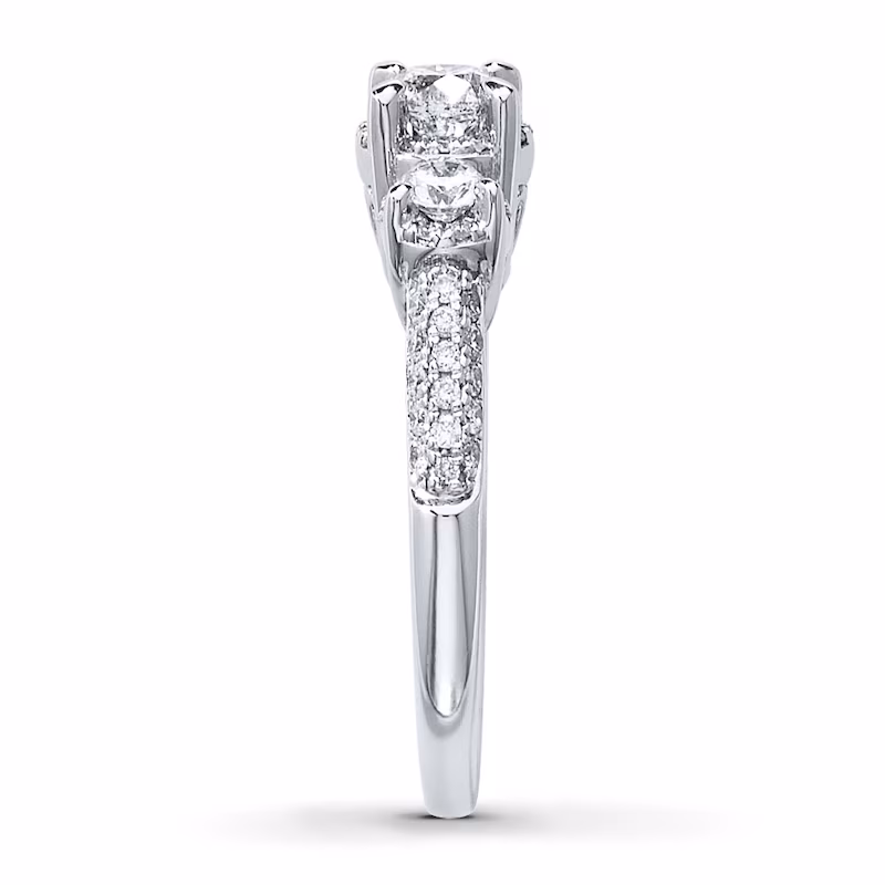 Representing your glowing past, present and future, this exquisite three-stone diamond ring will quickly become a cherished part of any jewelry collection. Additional round diamonds cascade down each side of the band. The ring, styled in 14K white gold, has a total diamond weight of 1 carat. Available online while supplies last. Previously Owned Treasures are not eligible for in-store pickup. Previously Owned Treasures may only be shipped either to your home address or to an alternate address. Price comparison based on new item pricing.