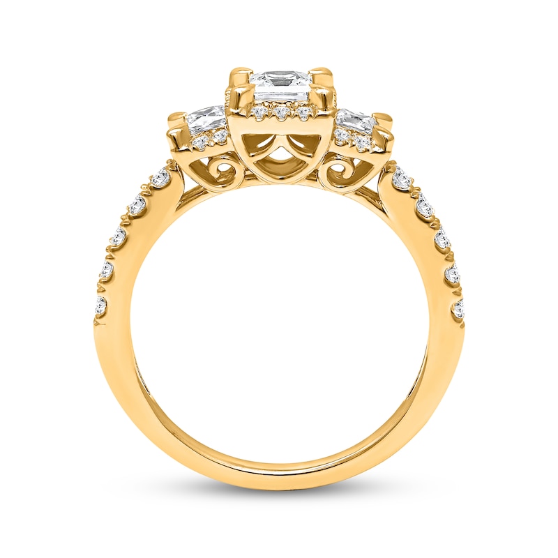 Make the moment sparkle with this glamorous engagement ring. A trio of fabulous princess-cut diamonds—including a 1/3-carat center diamond—draws the eye. Brilliant round diamonds frame each of the three stones and dance down the band. The ring is styled in timeless 10K yellow gold and has a total diamond weight of 1 carat. From the Now & Forever® bridal collection.
