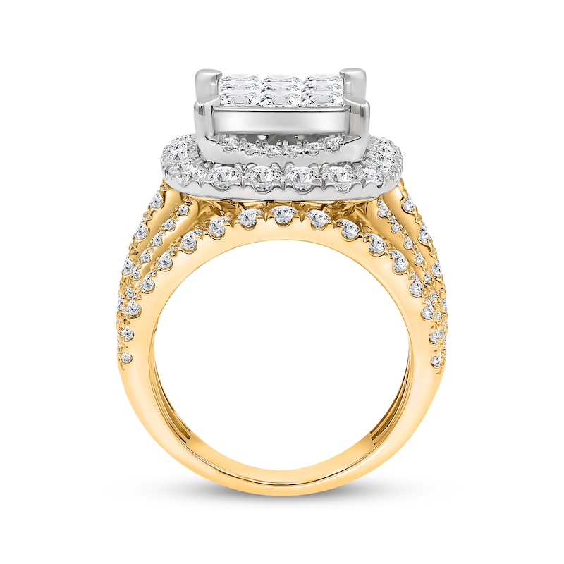 Wow her with the spectacular look of this eye-catching engagement ring. At its center, nine princess-cut diamonds create a gleaming composition. A double cushion-shaped frame of round-cut diamonds completes the spellbinding display. Beneath, five ribbons of round diamonds in varied sizes make up the dazzling split shank. Crafted in 10K white and 10K yellow gold, this ring has an incredible total diamond weight of 3 carats. From the Now & Forever® bridal collection.