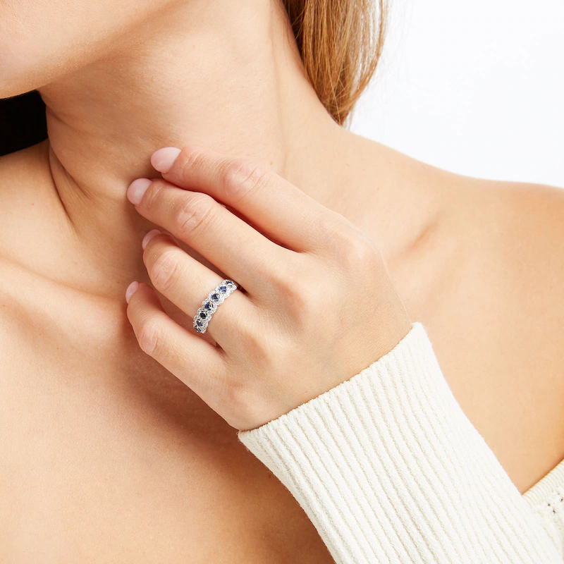 Square-cut natural sapphires are traced in sparkling curves of round diamonds in this stunning anniversary band. The ring is crafted of polished 10K white gold and has a total diamond weight of 1/4 carat.