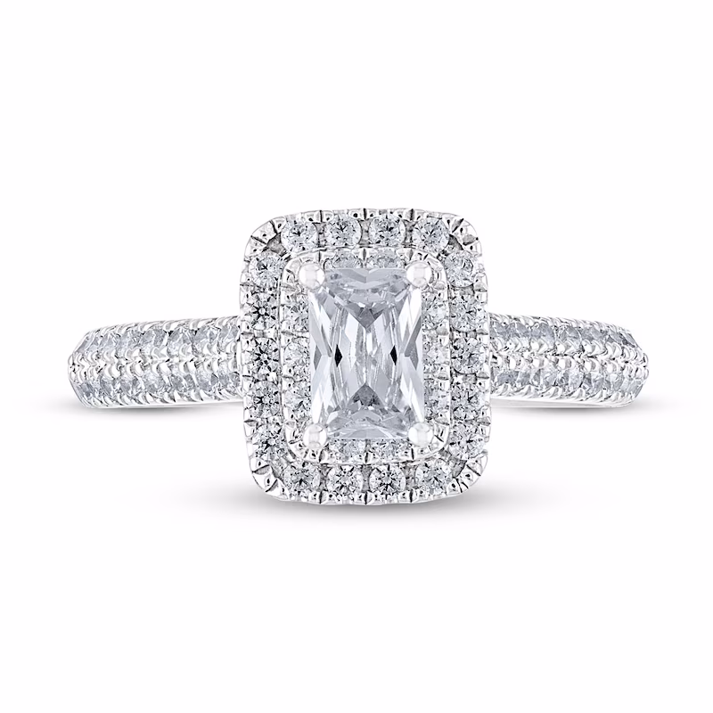 An elegant independently certified 1-carat emerald-cut diamond is the highlight of this classic THE LEO Diamond® engagement ring. Shimmering round diamonds halo the center diamond and line the 14K white gold band to bring the ringâs total diamond weight to 1 carat. The central diamond is laser-inscribed with a unique Gemscribe® serial number to ensure your peace of mind.