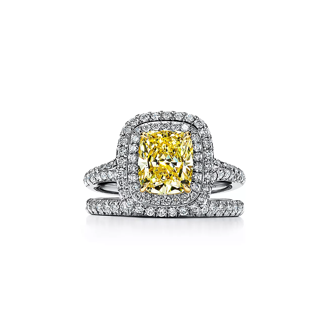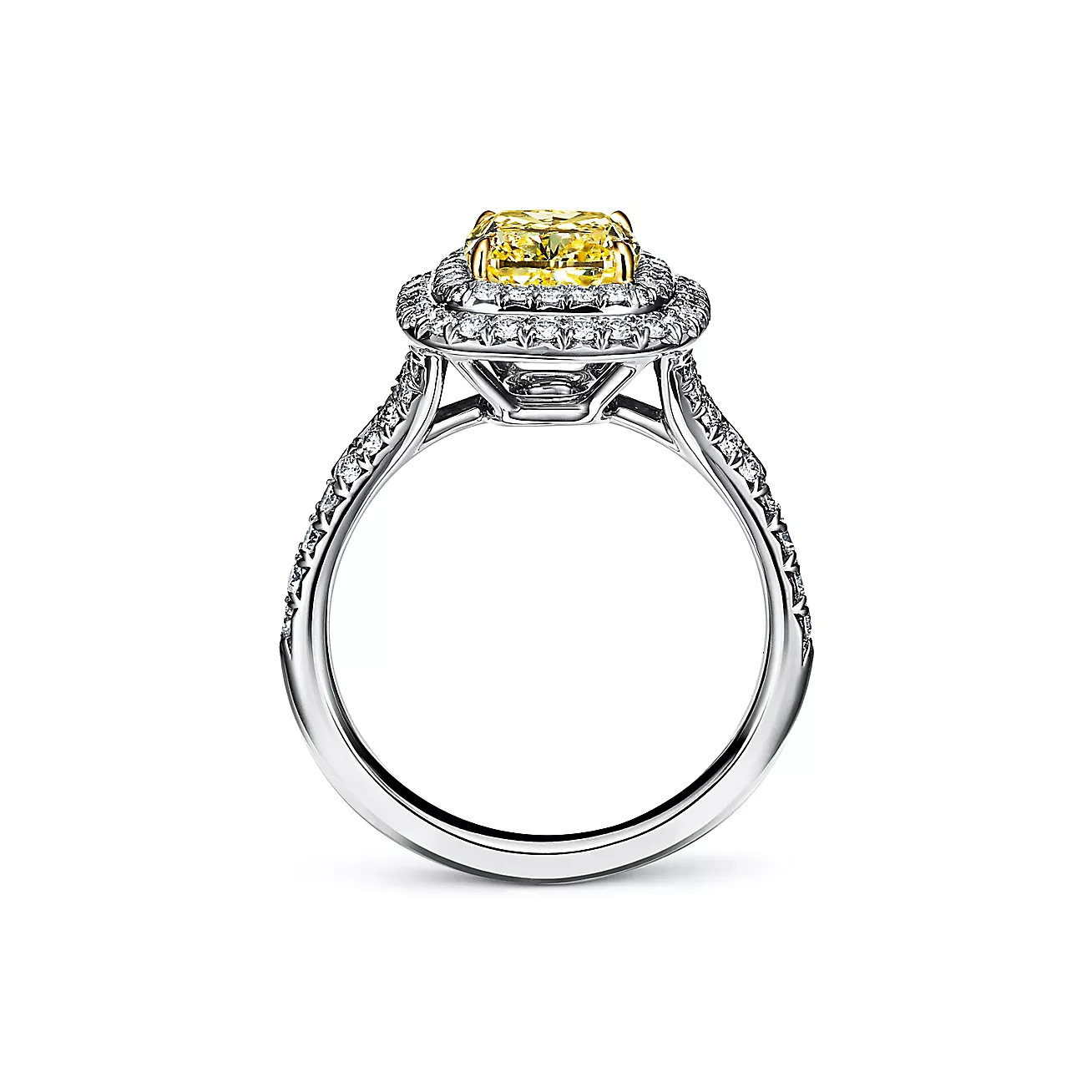 Just as the sun’s rays radiate in all directions, so too does the Tiffany Soleste engagement ring. The sparkling double row of diamond beads, the elegant cushion-cut yellow diamond center stone and the gorgeous diamond ring gather light everywhere in the design, reflecting an unparalleled brilliance. This stunning yellow diamond has a faceted crown and a diamond halo that makes it even more refined and elegant.