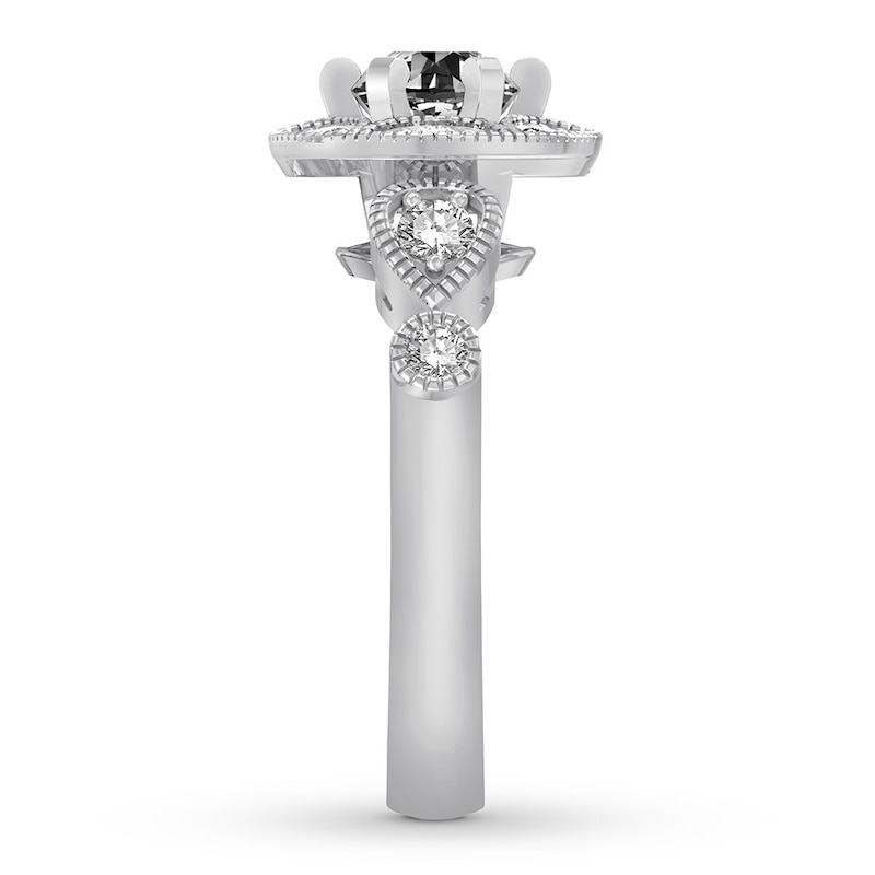 A 3/4-carat round black diamond is the center of attention in this stunning engagement ring for her. Round white diamonds encircle the center and line the band for exquisite contrast. The ring, with a total diamond weight of 1 carat, is set in 10K white gold.