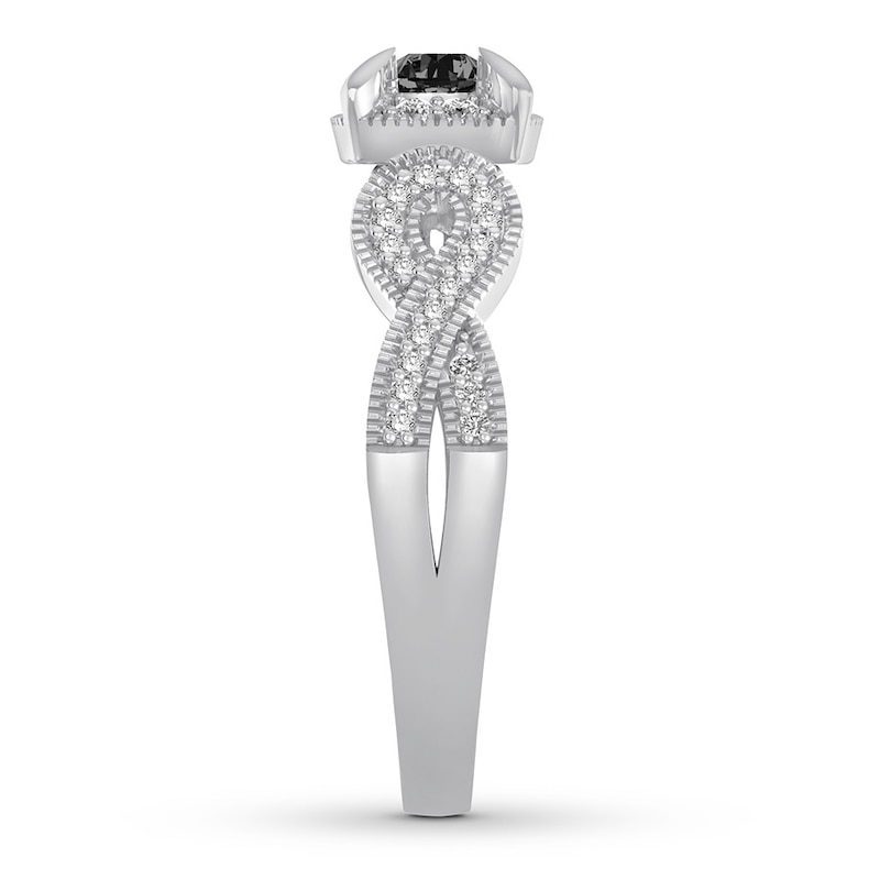 This vintage-style engagement ring has a unique twist. The center holds a 1/4 carat black diamond, surrounded by white diamonds. Additional round diamonds decorate the band of 10K white gold, bringing the total diamond weight of the ring to 1/2 carat. From the Now & Forever® bridal collection.