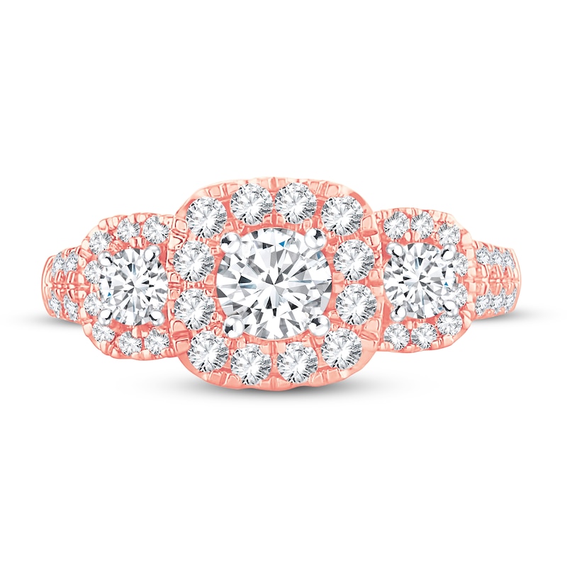 A breathtaking 1/2 carat round-cut diamond sparkles at the center of this beautiful engagement ring for her. Two brilliant round-cut diamonds flank either side, and each center diamond is framed by a halo of round diamonds. More round-cut diamonds shimmer down each side of the band in two rows, giving the 14K rose gold ring a total diamond weight of 1 1/2 carats. From the Now & Forever® bridal collection.