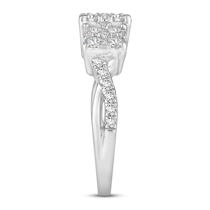This stunning diamond engagement ring for her features a multi-stone design, with three clusters of sparkling round-cut diamonds at the center. More round-cut diamonds stream down the sides of the 10K white gold band. The ring has a total diamond weight of 1 1/2 carats. From the Now & Forever® bridal collection.