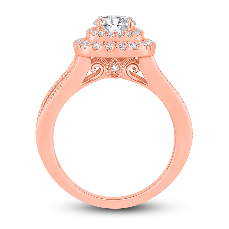 A breathtaking 3/4-carat round diamond sparkles at the center of this timeless engagement ring. Set in dreamy 14K rose gold, a beautiful double halo of round diamonds surrounds the center, and two rows of more round diamonds shimmer down the band. Two more round diamonds shine under the top design to finish the look. Classic milgrain gleams along the band, and the ring shines with a total diamond weight of 1 1/4 carats. From the Now & Forever® bridal collection.