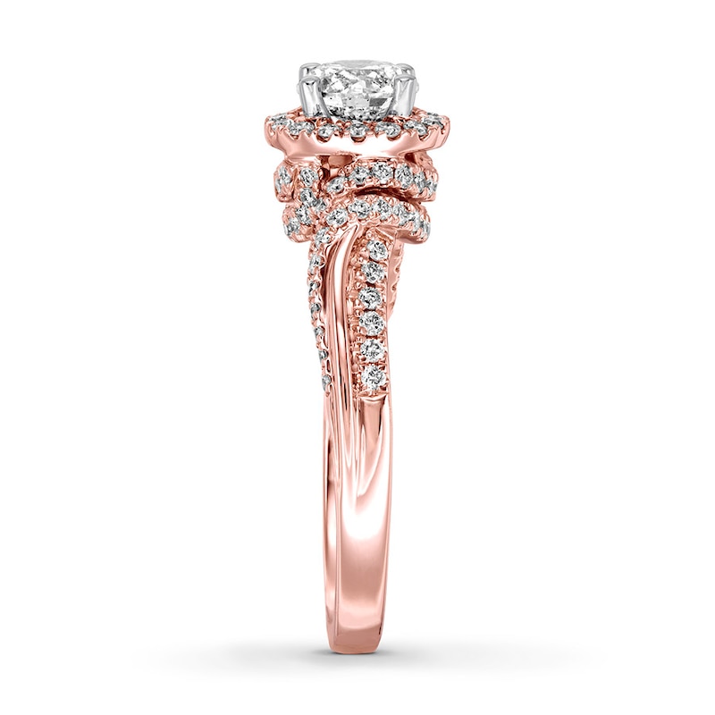 Glistening ribbons of round diamonds wrap around the band and encircle the sparkling round diamond center of this striking engagement ring. Crafted of 14K rose gold, the ring has a total diamond weight of 1 1/6 carats. From the Now & Forever® Bridal Collection.