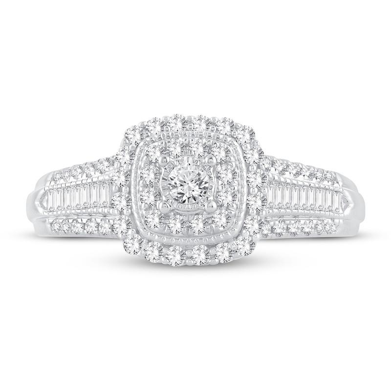 This striking diamond engagement ring for her features a brilliant round-cut diamond at its center, surrounded by two frames of more round diamonds. Beautiful baguette-cut and additional round diamonds shimmer down the sides of the band for a total diamond weight of 1/2 carat. The ring is fashioned in classic 10K white gold. From the Now & Forever® bridal collection.