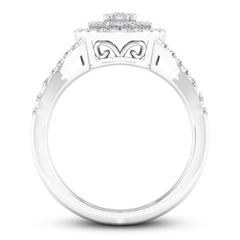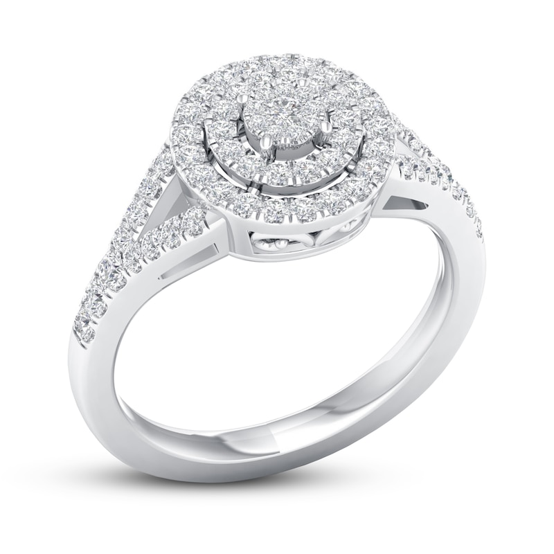 Round diamonds sparkle and shine throughout this incredible women's engagement ring. Round diamonds form the center and are graced by a double halo of round diamonds, with additional round diamonds flanking each side of the split band. The ring has a total diamond weight of 1/2 carat and is fashioned in 10K white gold. From the Now & Forever® bridal collection.