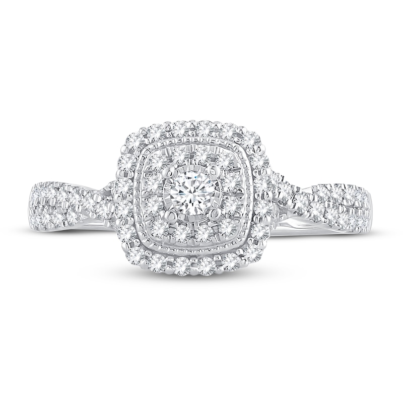 This gorgeous diamond engagement ring for her features a brilliant round-cut diamond at its center, surrounded by two frames of round-cut diamonds. More round diamonds shimmer down the twisted band for a total diamond weight of 1/2 carat. The ring is crafted in classic 10K white gold. From the Now & Forever® bridal collection.