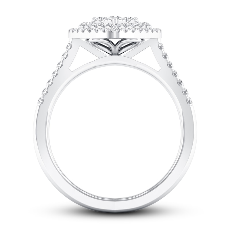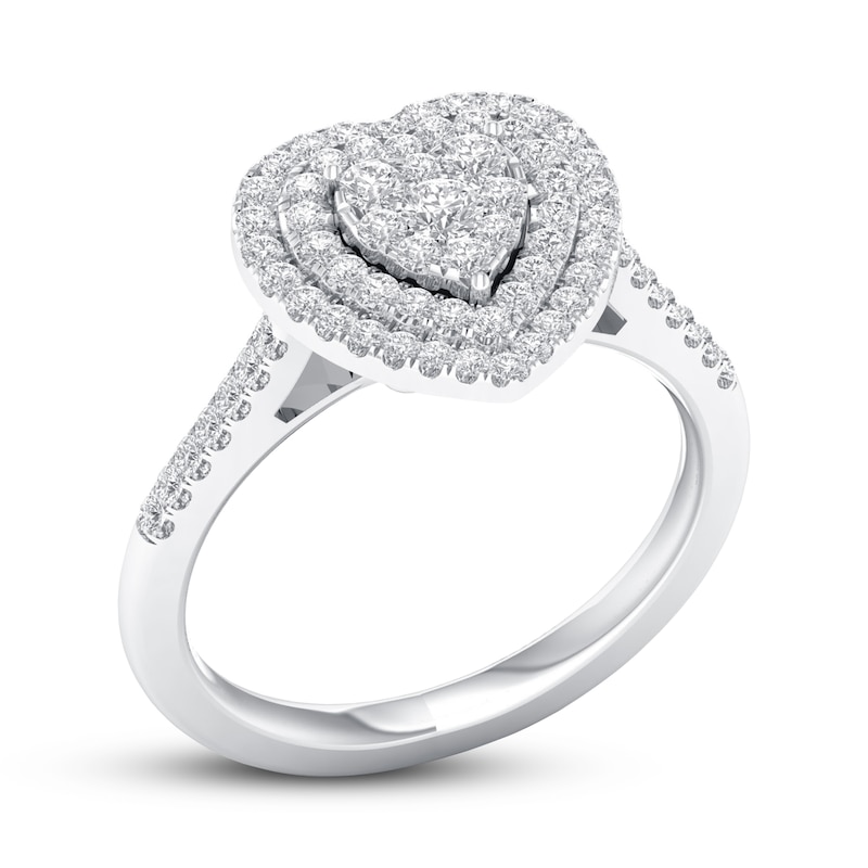 Brilliant round diamonds form the shape of a heart in this romantic engagement ring for her. The center diamonds are haloed by two rows of round diamonds, and additional round diamonds flank down each side of the band. The 10K white gold ring has a total diamond weight of 1/3 carat. From the Now & Forever® bridal collection.