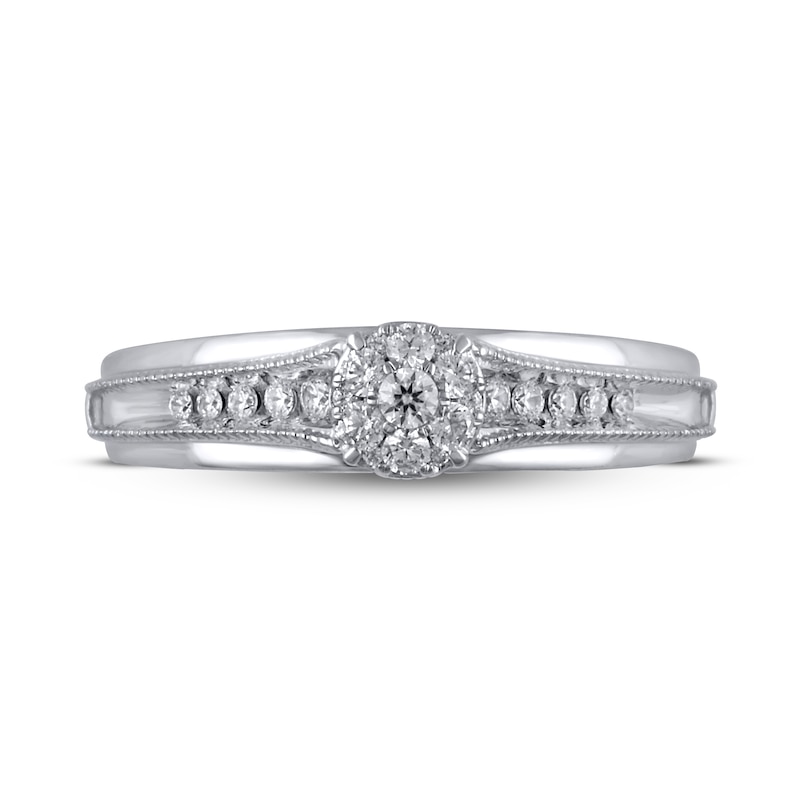 From the Now & Forever® bridal collection comes this magnificent diamond engagement ring for her. Crafted of 10K white gold, the pretty ring features a center round diamond enveloped by a halo of sparkling round diamonds. Twinkling round diamonds grace the band and give the ring a total diamond weight of 1/4 carat.