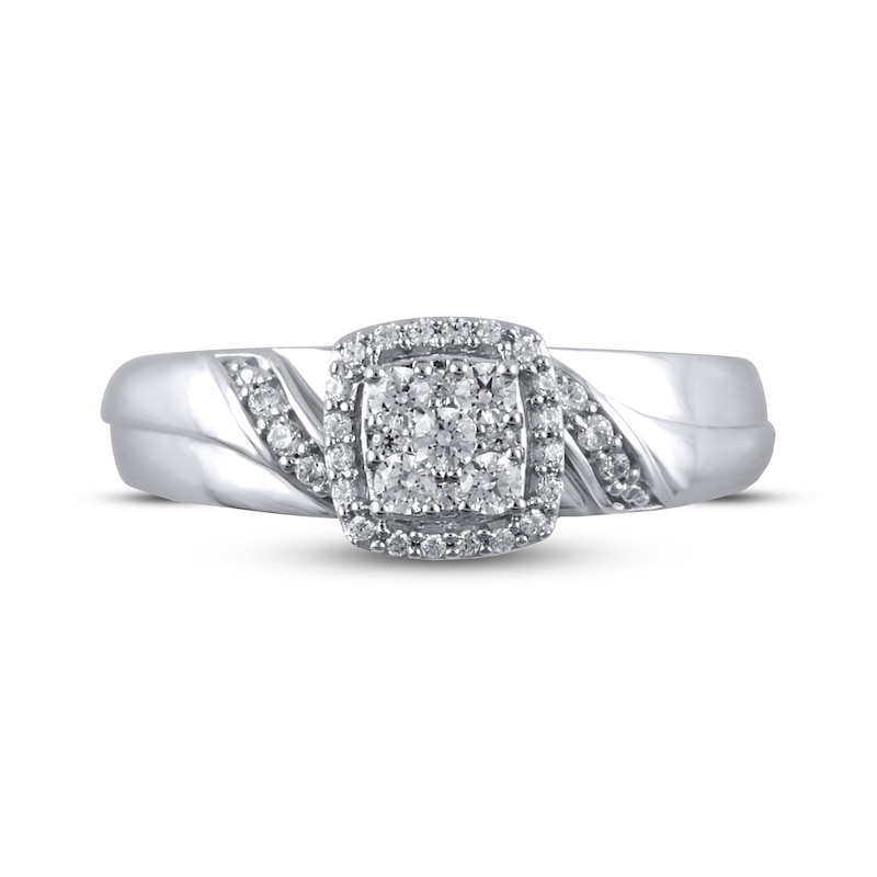 A square center containing shining round diamonds steals the spotlight of this pretty diamond engagement ring for her. From the Now & Forever® bridal collection, the ring features more round diamonds that frame the center and also continue to sweep across the 10K white gold band. The ring has a total diamond weight of 1/4 carat.