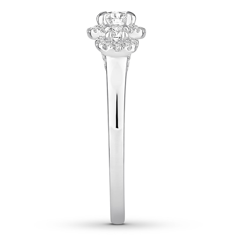 Traditionally symbolic of your past, present, and future, a three-stone engagement ring offers a gorgeous opportunity to tell your unique love story. This stunning ring features three round diamonds haloed by more diamonds for even more brilliance. Additional diamonds line the side of the ring to complete the look. Crafted of 14K white gold, the ring has a total diamond weight of 1 carat.