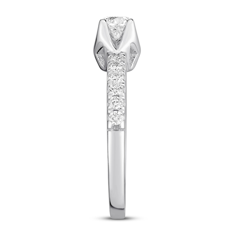 Angular prongs give the 1/2-carat round center diamond a contemporary look in this gorgeous engagement ring. More round diamonds sparkle along the 14K white gold band, bringing the total diamond weight to 3/4 carat.