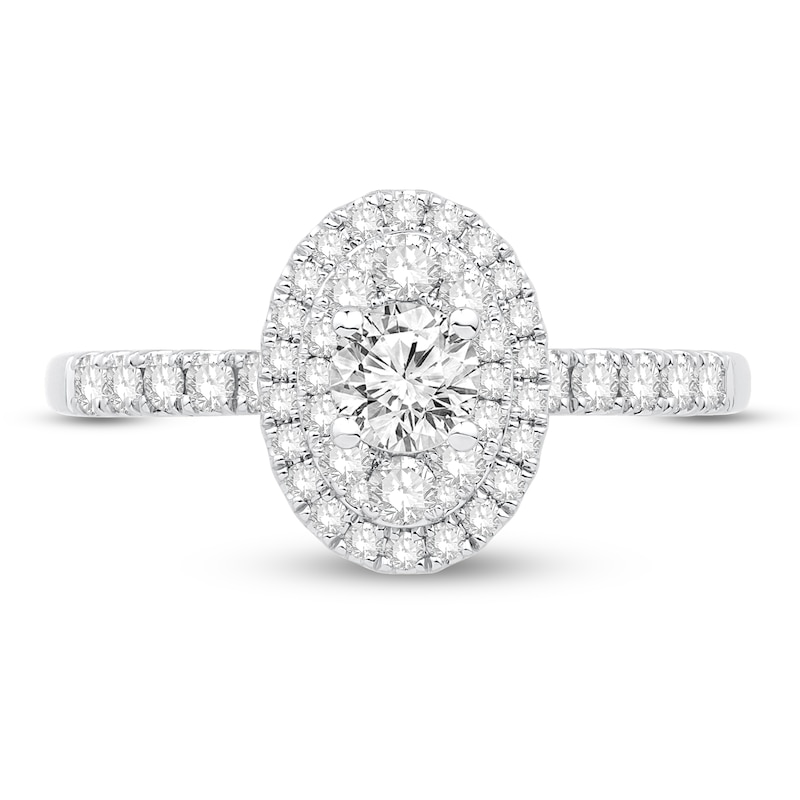 A stunning round-cut diamond sparkles at the center of this diamond engagement ring for her. A double halo of round-cut diamonds frames the center stone, creating an oval-shape. More round diamonds line each side of the 14K white gold band, giving the ring a total diamond weight of 3/4 carat. From the Now & Forever® bridal collection.
