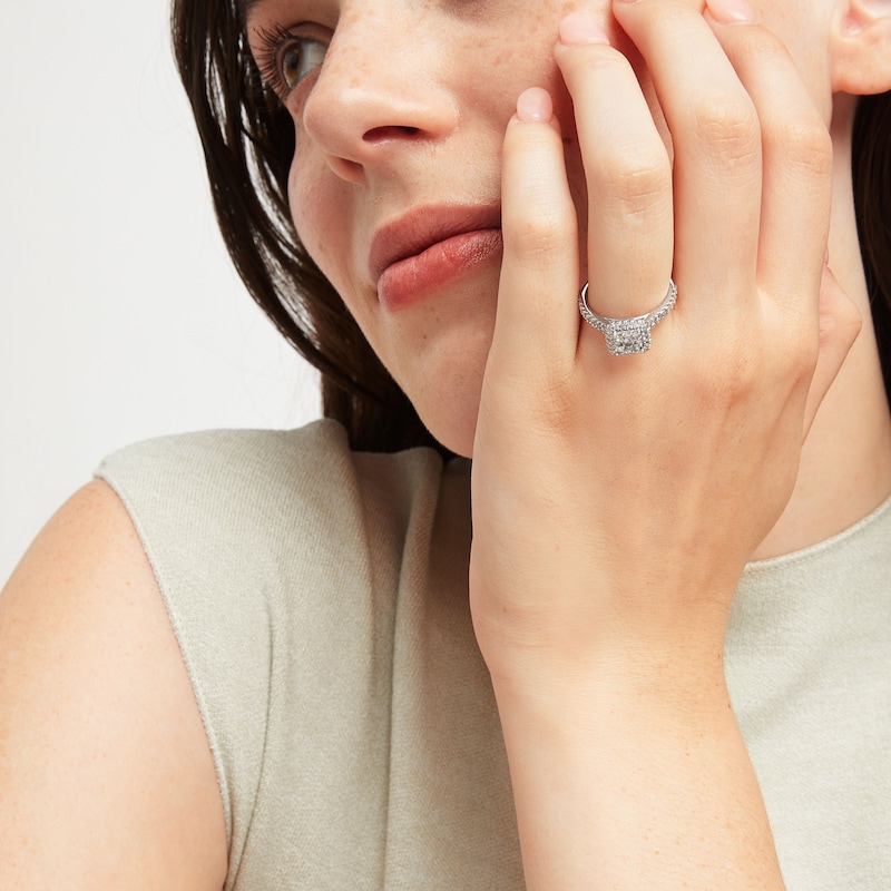 A brilliant array of sparkling round-cut diamonds forms the center of this beautiful diamond engagement ring for her. A halo of round-cut diamonds surrounds the center, and more round-cut diamonds dazzle down each side of the band. The 10K white gold ring has a total diamond weight of 3/4 carat. From the Now & Forever® bridal collection.