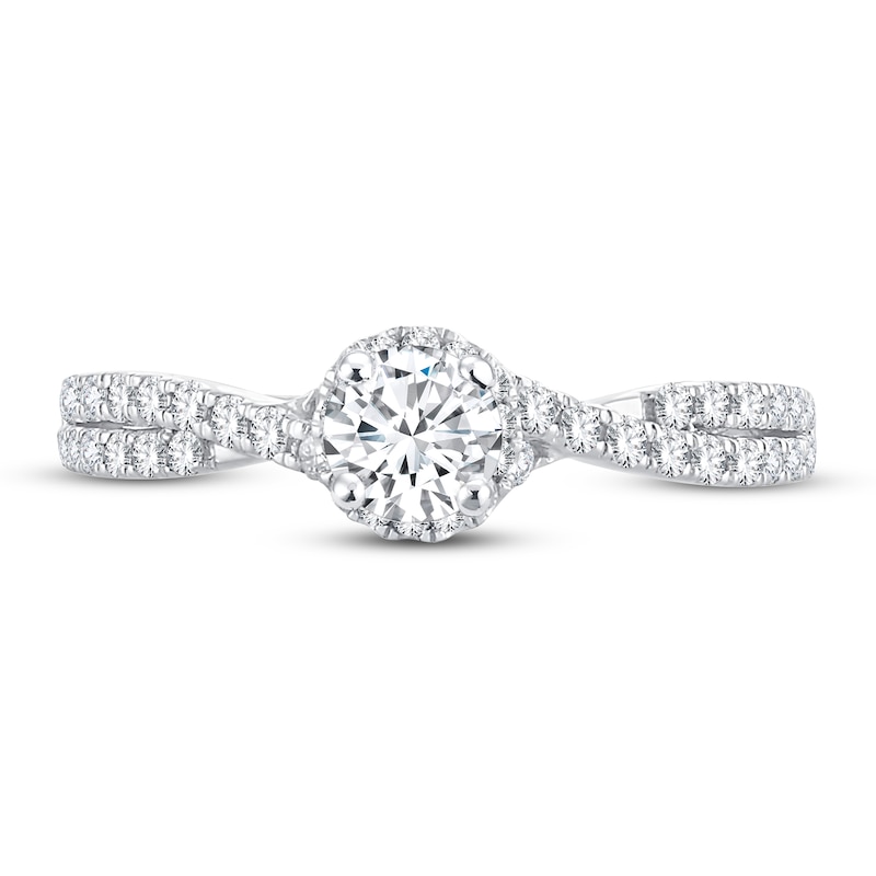 A brilliant round-cut diamond sparkles at the center of this beautiful engagement ring for her. More round diamonds frame the center and flow down the twisted band for a total diamond weight of 3/4 carat. The ring is fashioned in iconic 14K white gold. From the Now & Forever® bridal collection.