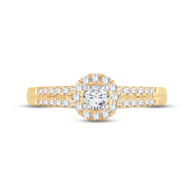 They'll be swept away (and say YES!) with the breathtaking sparkle of this diamond engagement ring. A brilliant round-cut diamond is a remarkable focal point when embraced by a shimmering surround of more round diamonds. A striking combination of baguette-cut diamonds and extra round diamonds adorn the band of the stylish silhouette. Crafted in classic 14K yellow gold, the ring has a total diamond weight of 3/8 carat and is from our Now and Forever® bridal collection.