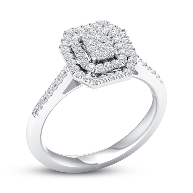A brilliant double halo of round diamonds shines in this engagement ring for her. Round diamonds form the center, and additional round diamonds grace both sides of the band for a total diamond weight of 3/8 carat. From the Now & Forever® bridal collection.