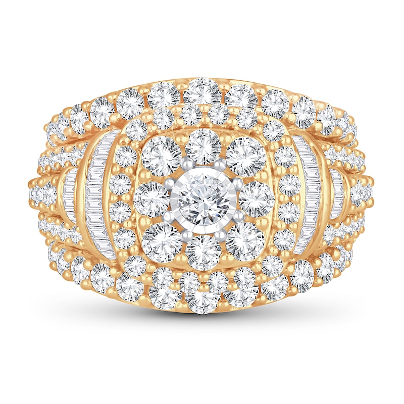 This captivating diamond engagement ring for her features a brilliant round-cut diamond at its center, framed by two rows of more round diamonds. Striking baguette-cut diamonds sparkle along each side, and more round diamonds sparkle down each side of the band in multiple rows. The ring is fashioned in beautiful 14K yellow gold and has a total diamond weight of 3 carats. From the Now & Forever® bridal collection.