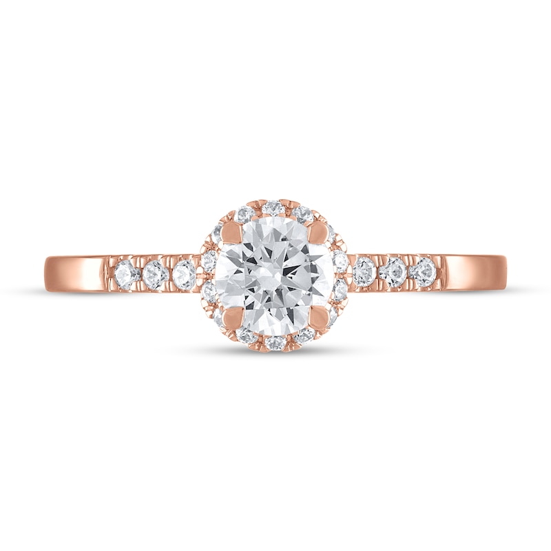 A breathtaking 1/2-carat round-cut diamond shimmers at the center of this beautiful engagement ring, haloed by round diamonds. Set in dreamy 14K rose gold, trios of brilliant round diamond accents sparkle downt the band for a total diamond weight of 5/8 carat. The gender-neutral ring is available in sizes 5-12.