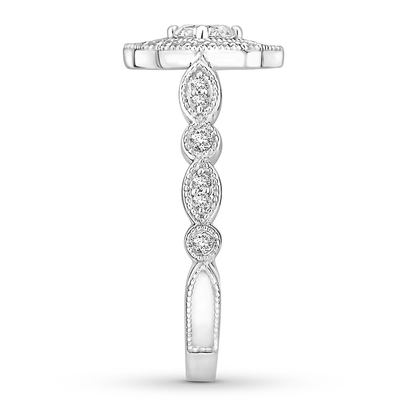 Elegant and timeless, this gorgeous engagement ring has vintage flair. The 1/3-carat round diamond center sparkles in an enchanting frame of diamonds and milgrain flourishes. Milgrain frames and diamonds decorate the band for the finishing touch. Styled in 14K white gold, the ring has a total diamond weight of 5/8 carat.