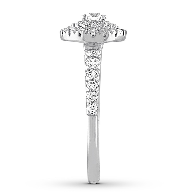 You've found a love that lasts, and you are ready to begin forever together. This fabulous engagement ring is the first step. Sparkling round diamonds create a gorgeous halo design in the center and adorn the band for a total diamond weight of 5/8 carat. The ring is fashioned in versatile 14K white gold.