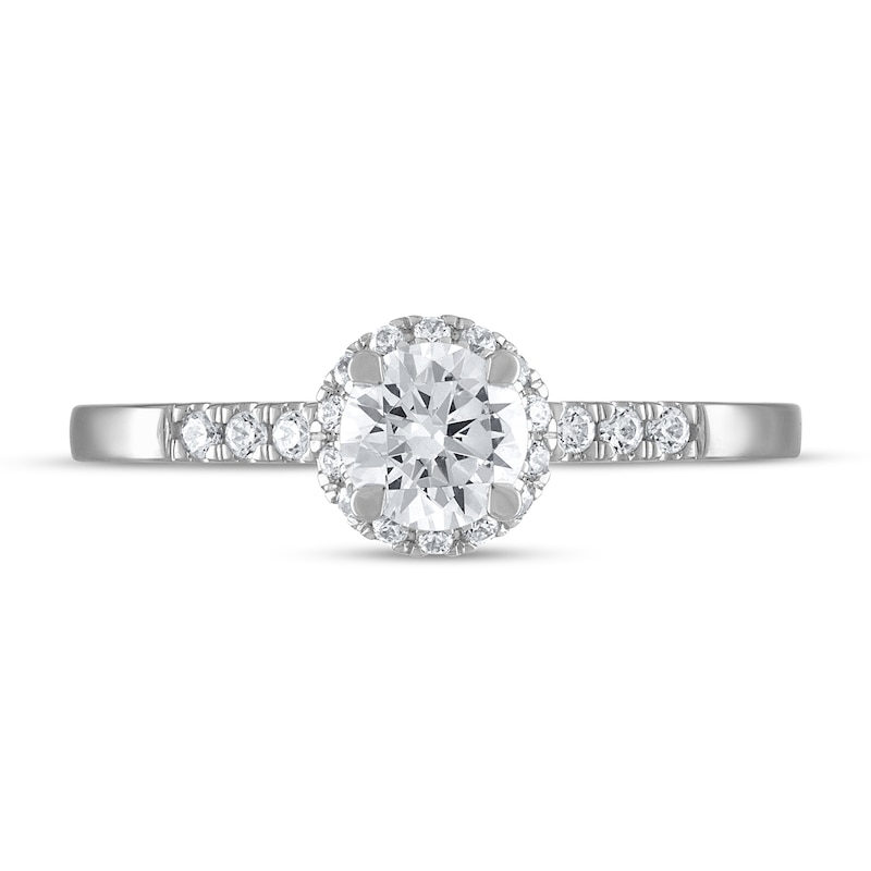 A breathtaking 1/2-carat round-cut diamond shimmers at the center of this beautiful engagement ring, haloed by round diamonds. Set in iconic 14K white gold, trios of brilliant round diamond accents sparkle downt the band for a total diamond weight of 5/8 carat. The gender-neutral ring is available in sizes 5-12.