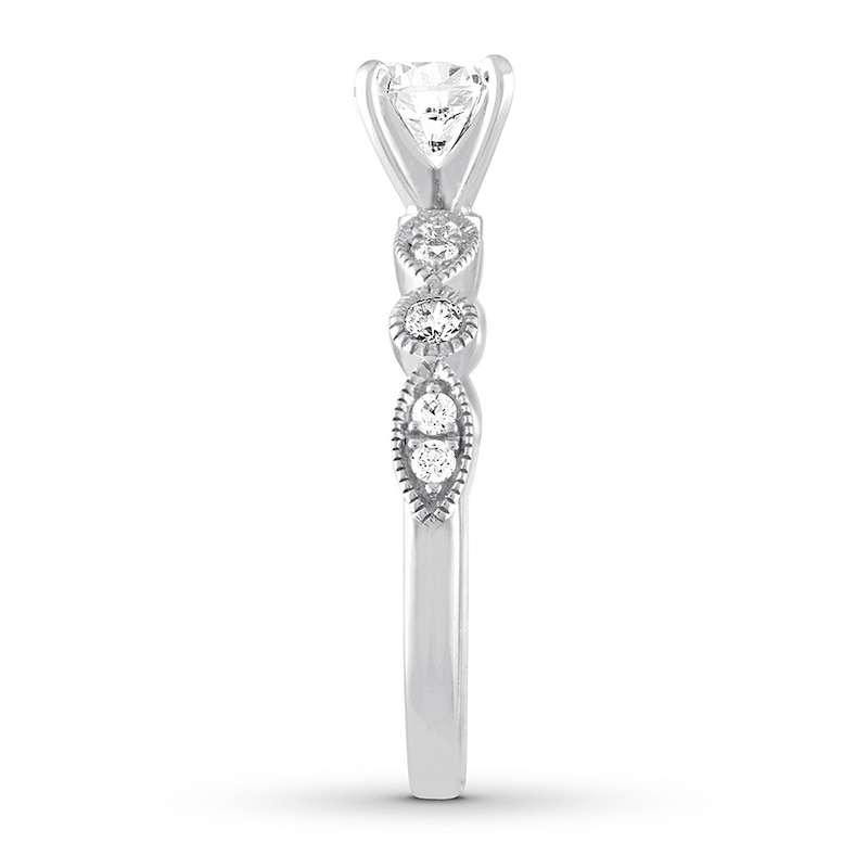 A breathtaking round diamond is the focal point of this elegant engagement ring for her. Milgrain-edged shapes along the band give the ring a distinctly vintage look. The 14K white gold ring has a total diamond weight of 7/8 carat.