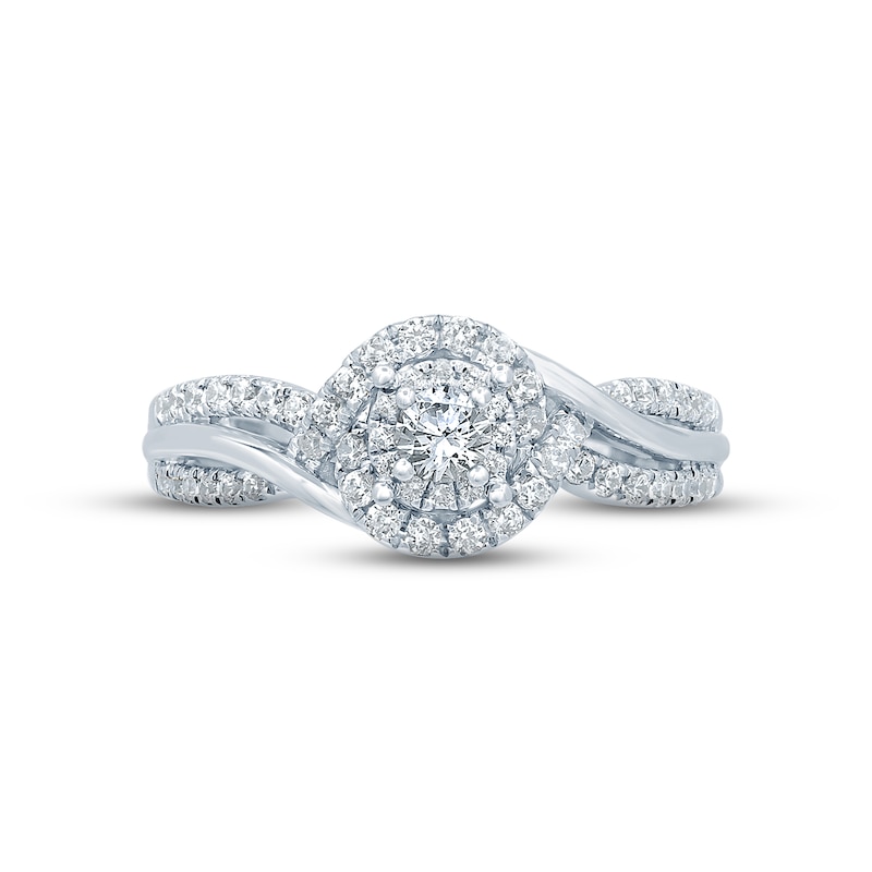 A radiant round diamond is haloed in sparkling ribbons of round diamonds on this splendid engagement ring for her. Sweeping down the band, the diamonds intertwine with smooth swirls of 14K white gold. The ring has a total diamond weight of 3/8 carat and is from our Now & Forever® bridal collection.