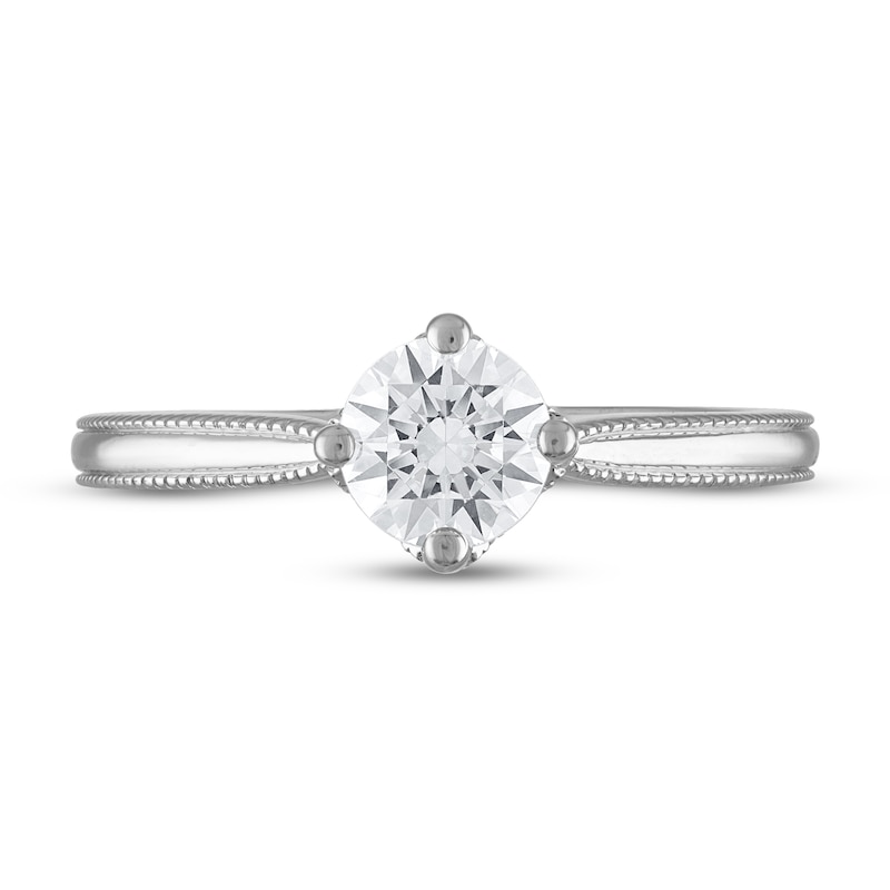 This exquisite diamond engagement ring for her features a stunning round-cut diamond at its center, set in classic 14K white gold. Milgrain detailing lines the sides and sparkling diamonds peek out under the center diamond for a total diamond weight of 1 carat.