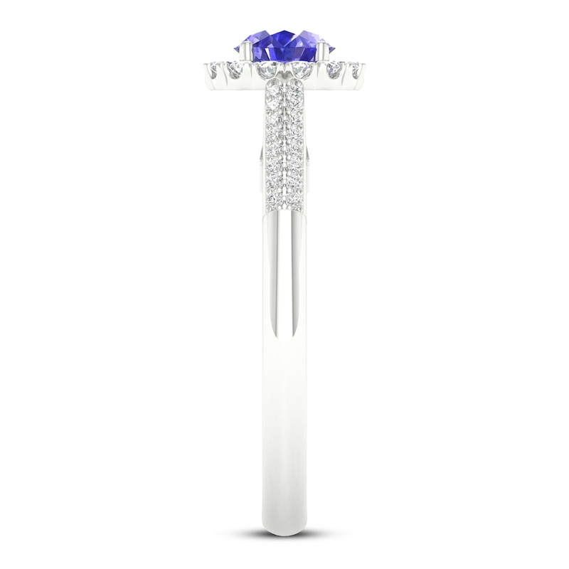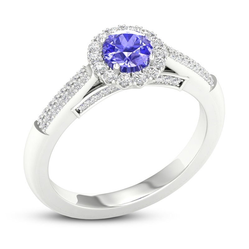 This gorgeous engagement ring is designed to showcase the round-cut tanzanite center stone's vivid color. The elegant setting features a halo of sparkling diamonds and is set in iconic 10K white gold. Additional diamonds shimmer down each side of the band, giving the ring a total diamond weight of 1/4 carat. From the Now & Forever® bridal collection.