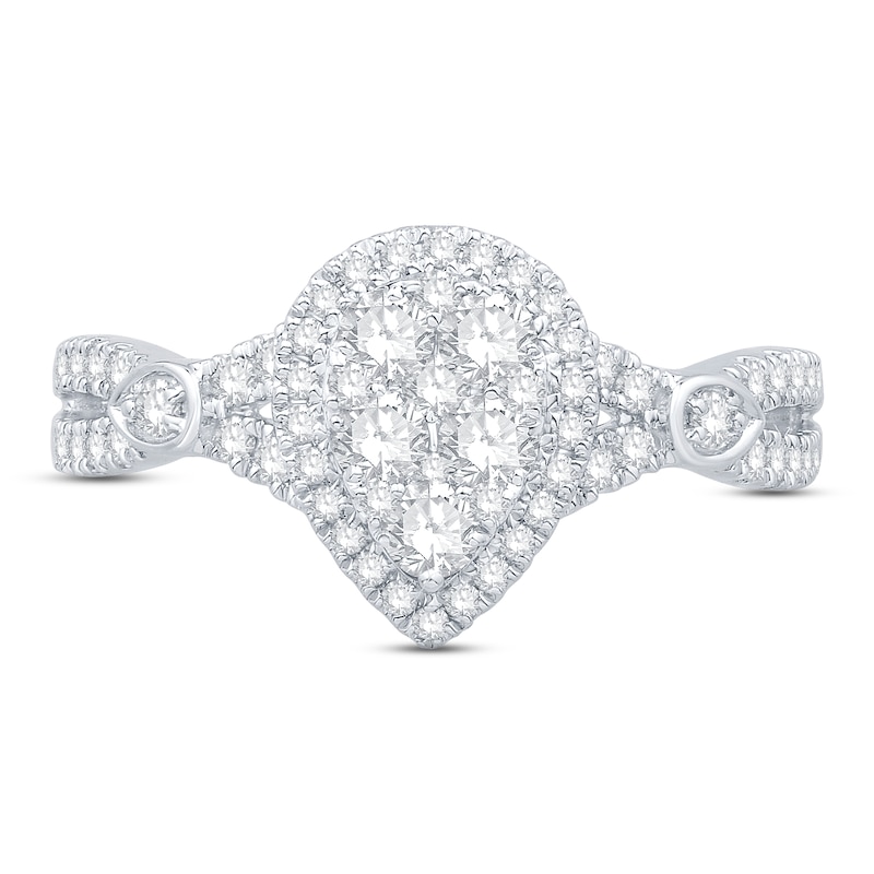 A cluster of shimmering round diamonds framed by more round diamonds form a pear design at the center of this exquisite gender neutral engagement ring. Two rows of radiant round diamonds sparkle along the crisscrossing 14K white gold band, accented on each side by a single round diamond in a pear-shaped setting. The ring has a total diamond weight of 3/4 carat and is available in sizes 5-12. From the Now and Forever® collection.
