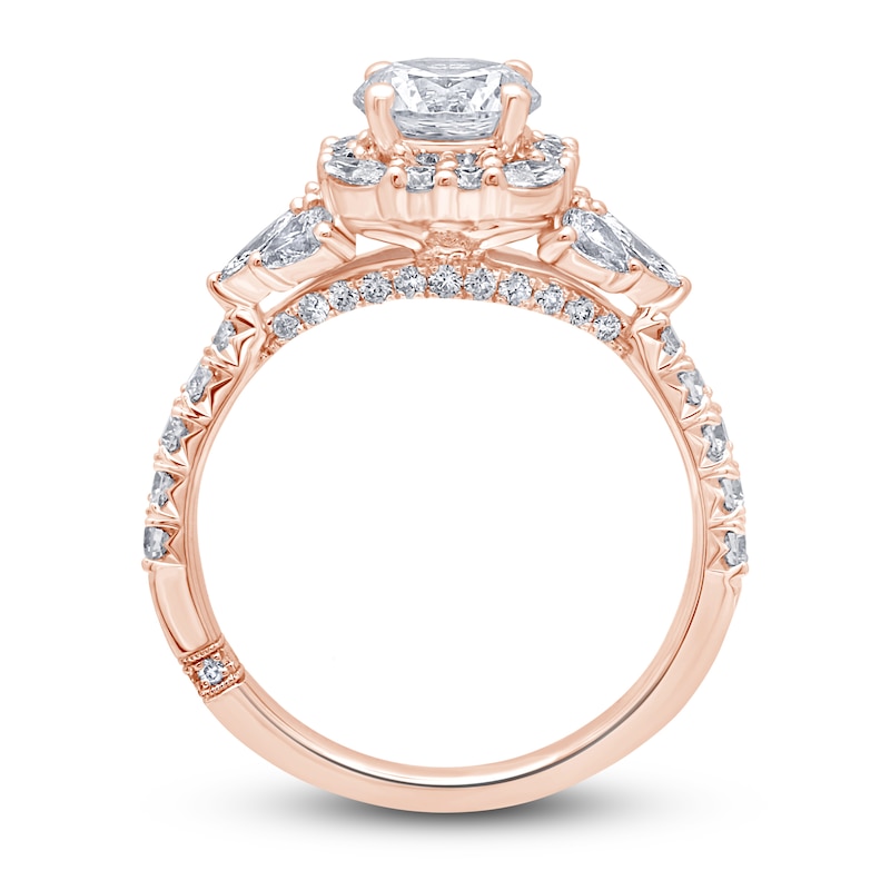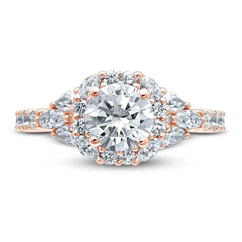 A beautiful 1-carat independently-certified round diamond sparkles at the center of this radiant engagement ring. Set in dreamy 18K rose gold, a halo of round and marquise-cut diamonds surrounds the center diamond. Pear-shaped and marquise-cut diamonds flank each side, and brilliant round diamonds sparkle down the band for a total diamond weight of 1 7/8 carats. From the Monique Lhuillier Bliss collection, available exclusively at KAY. Please note: This ring is available in limited sizes. If you don't see your size here, please visit a store to order your ring.