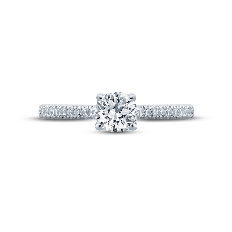 This marvelous engagement ring showcases a stunning 1/2-carat round-cut diamond as the sparkling centerpiece. More round diamonds grace the band and shine across the bridge for a total diamond weight of 5/8 carat. The ring is crafted in cool 18K white gold and is finished by classic milgrain detailing. The independently certified center diamond is laser-inscribed with a unique Gemscribe® serial number to ensure your peace of mind. From the Monique Lhuillier Bliss collection, available exclusively at KAY. Please note: This ring is available in limited sizes. If you don't see your size here, please visit a store to order your ring.
