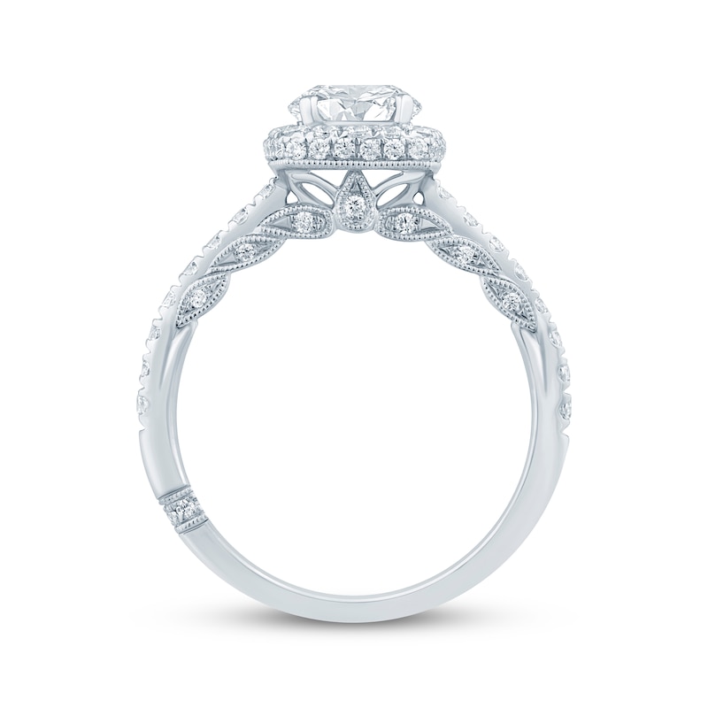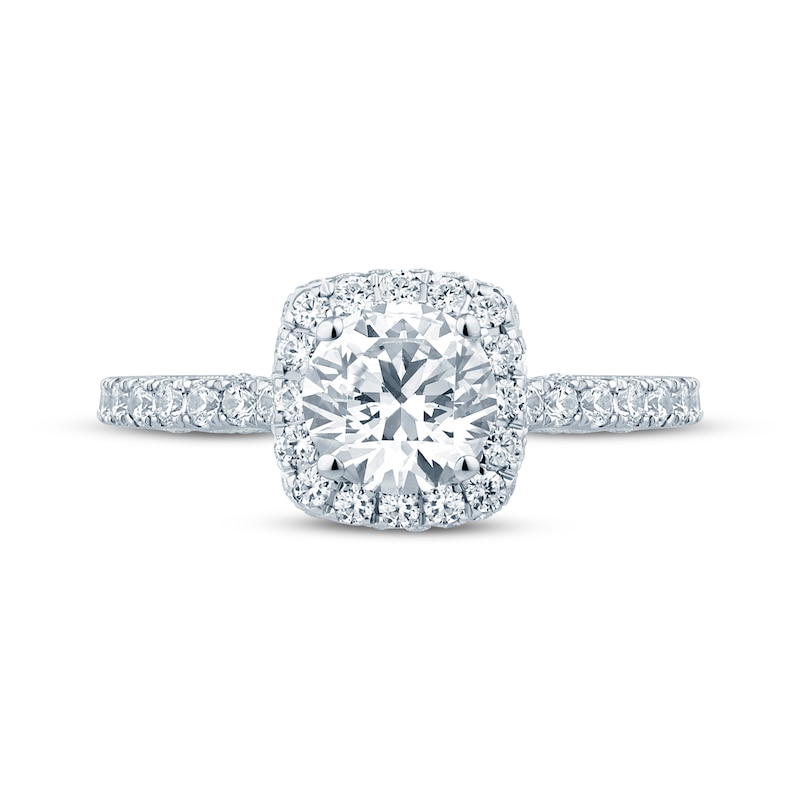 Make the moment magical by presenting this splendid engagement ring. The centerpiece is a luminous 1-carat round diamond wrapped in a cushion-shaped frame of smaller round diamonds. Additional round diamonds line the band and shimmer across the bridge amid charming milgrain accents. The ring is styled in 18K white gold and has a total diamond weight of 1 5/8 carats. The independently certified center diamond is laser-inscribed with a unique Gemscribe® serial number to ensure your peace of mind. From the Monique Lhuillier Bliss collection, available exclusively at KAY. Please note: This ring is available in limited sizes. If you don't see your size here, please visit a store to order your ring.