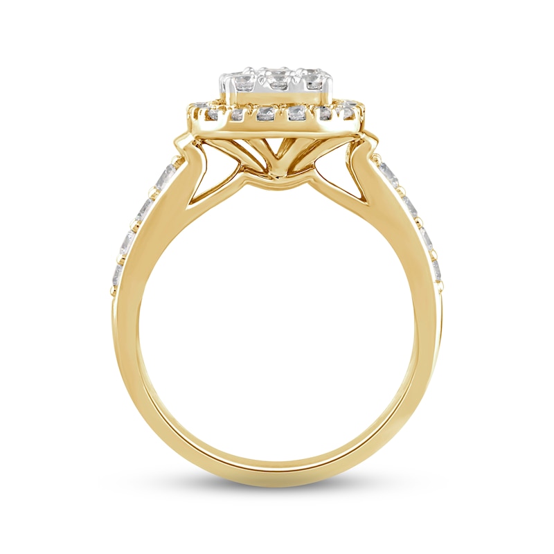 Express your love with this remarkable engagement ring styled in timeless 14K yellow gold and white rhodium. An array of round diamonds comprises the elegant center, while gleaming collars frame the cushion-shaped silhouette. More round diamonds shimmer halfway down the band for a total diamond weight of 1 carat. From the Now & Forever® bridal collection.