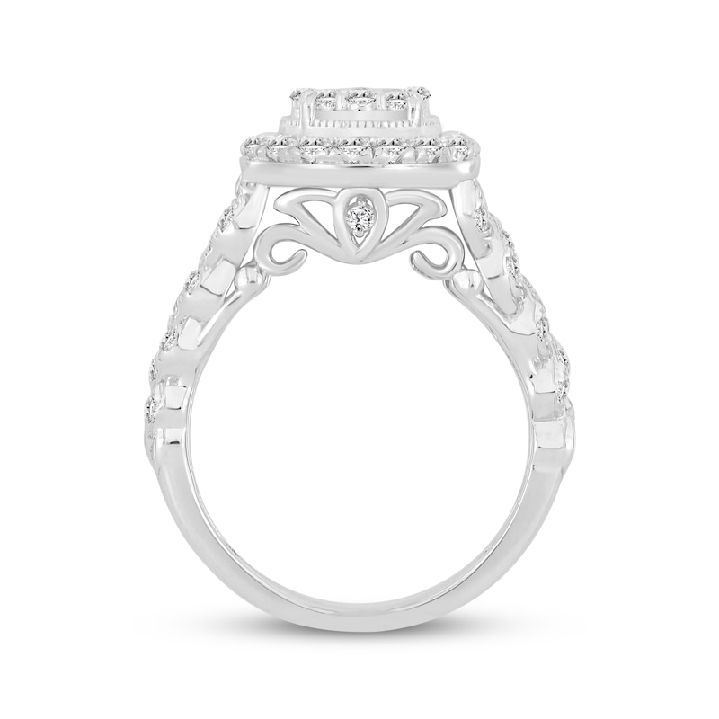 This heirloom-inspired engagement ring features a composite of sparkling round diamonds at its center, lined with a ribbon of milgrain detailing and a halo frame of round diamonds. Additional round diamonds line the twist shank, while a single diamond on each side of the scrolling bridge creates sparkle from every angle. Created in 14K white gold, this dramatic style has a total diamond weight of 3/4 carat. From the Now & Forever® bridal collection.