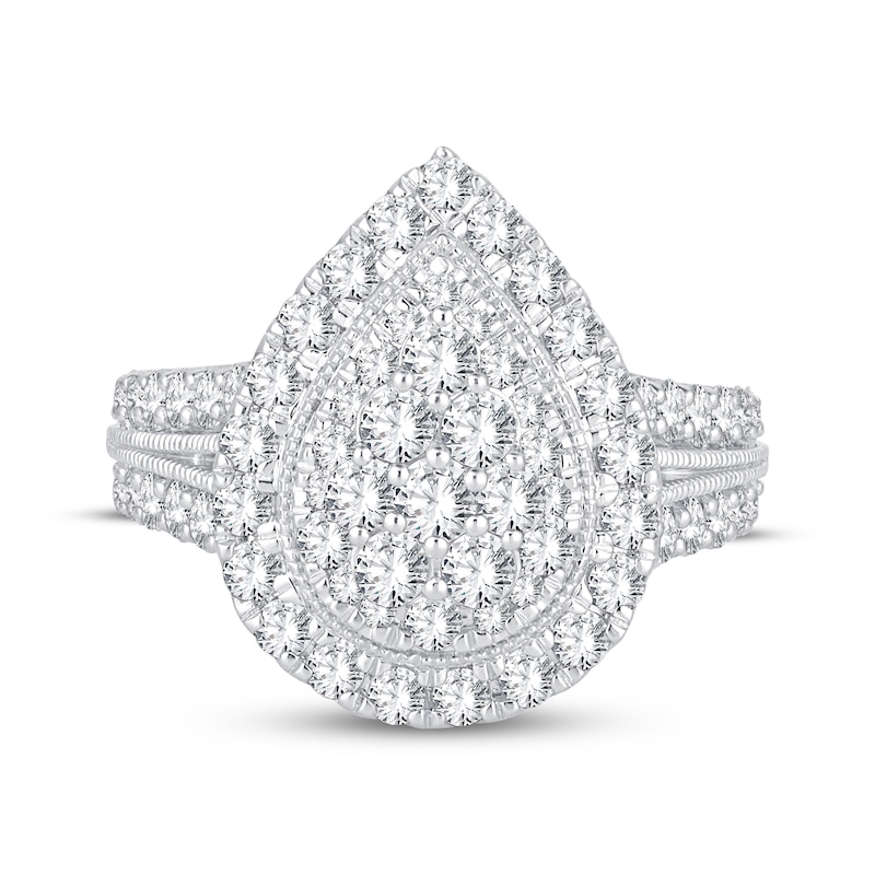 This exquisite engagement ring features a glittering pear-shaped center that shines with an array of radiant round diamonds and milgrain detailing. Adorning the subtly split-shank, additional round diamonds bring the total diamond weight to an impressive 2 carats. The ring is styled in modern 10K white gold and is from our Now & Forever® bridal collection.