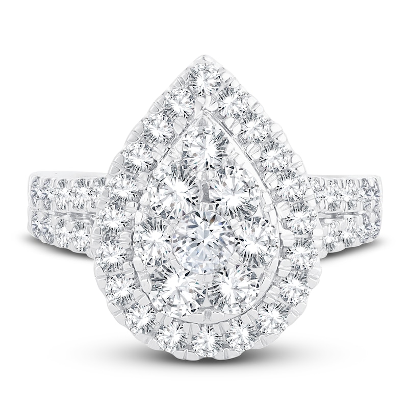 A gorgeous cluster of round diamonds sparkles at the center of this teardrop-shaped engagement ring. Set in iconic 14K white gold, brilliant round diamonds halo the center and sparkle down the band in dual rows. The ring has a total diamond weight of 2 carats. From the Now & Forever® bridal collection.