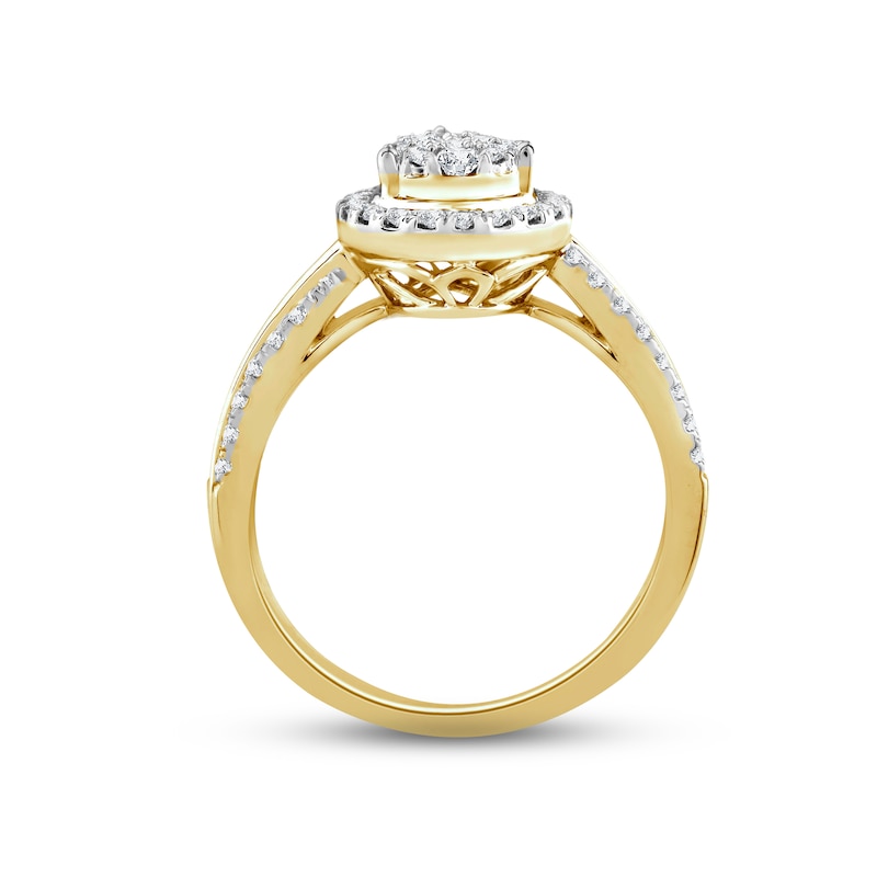 The pear-shaped, multi-diamond center of this glamorous engagement ring is arrayed in glistening round diamonds that draw the eye. More radiant round diamonds sweep in two rows halfway down the chic asymmetrical band. Crafted in 14K yellow gold with white rhodium contrast, the ring has a total diamond weight of 3/4 carat. From the Now & Forever® bridal collection.
